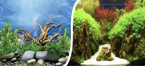 Dvostranska akvarijska tapeta z motivom skal in rastlin