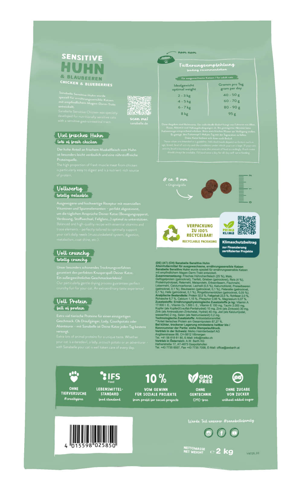 Mačjo hrano Sanabelle Sensitive odlikuje visoka gostota hranilnih snovi, odlična predelava in okusnost. S čimer se potreba po hrani bistveno zmanjša, črevesni trakt pa je temu ustrezno manj obremenjen.
