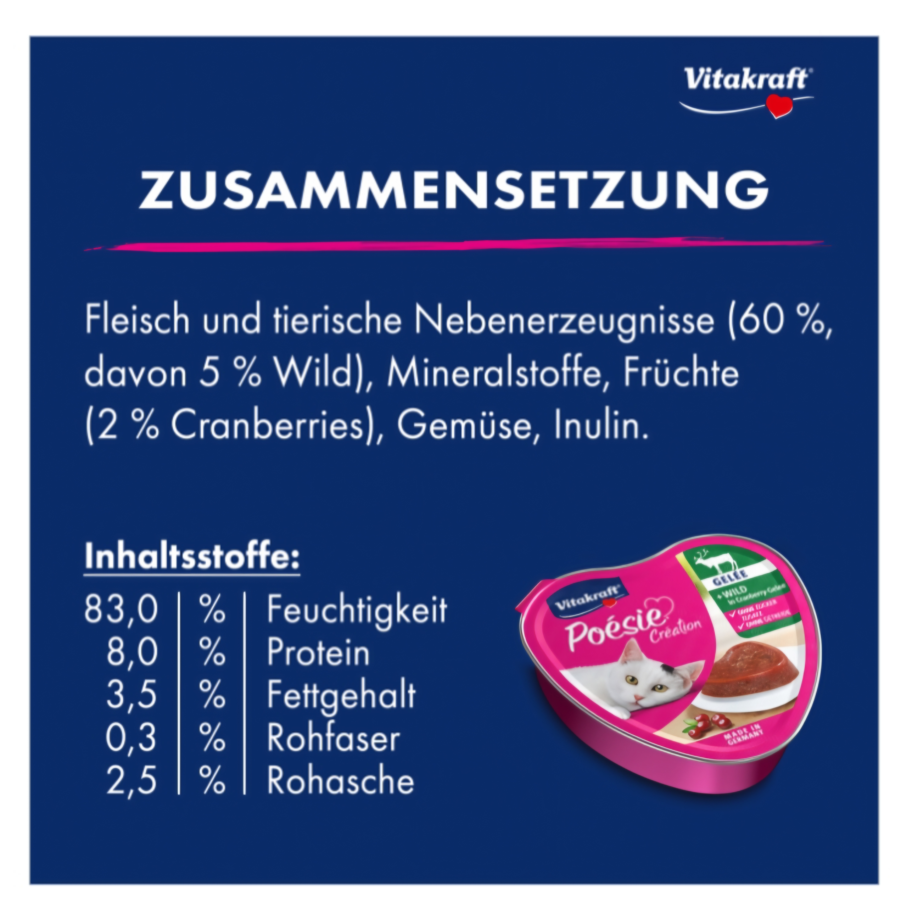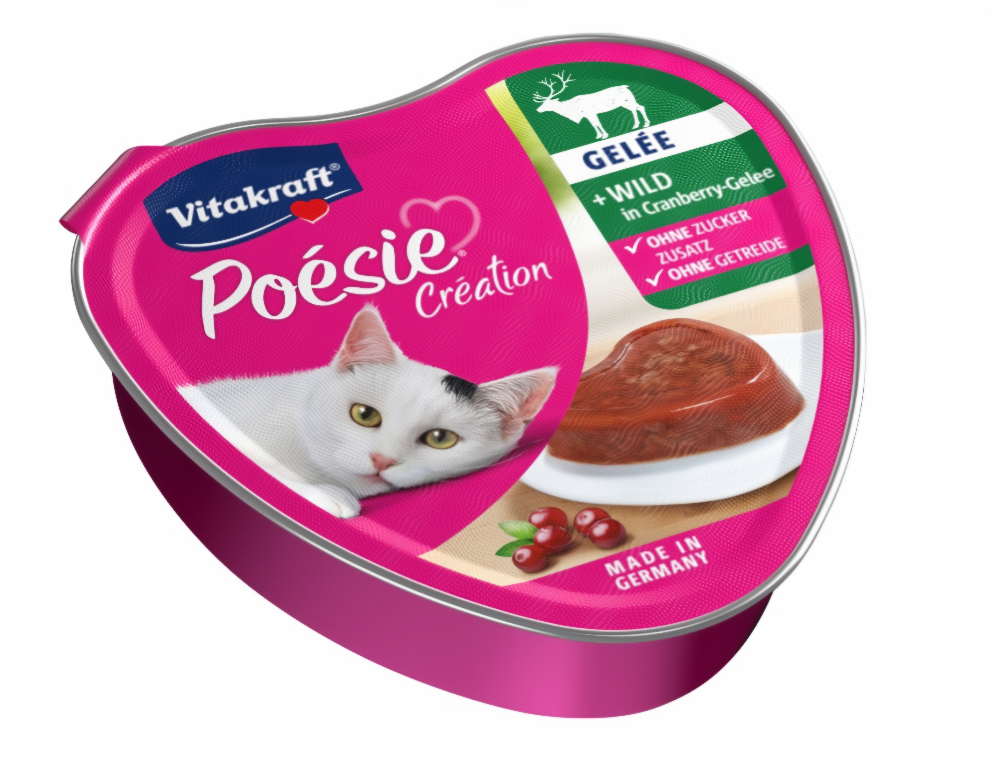 Vsaka skleda Poésie® vsebuje neustavljiv okus, najboljše sestavine in uravnoteženo porcijo ljubezni – točno to, kar si vaša mačka želi. Ta okusen obrok je naravno idealno prilagojen prehranskim potrebam mačk in navdušuje s svojo najvišjo kakovostjo. In zahvaljujoč nežni pripravi jo lahko celo vidite. Vitakraft. Narejeno z ljubeznijo.