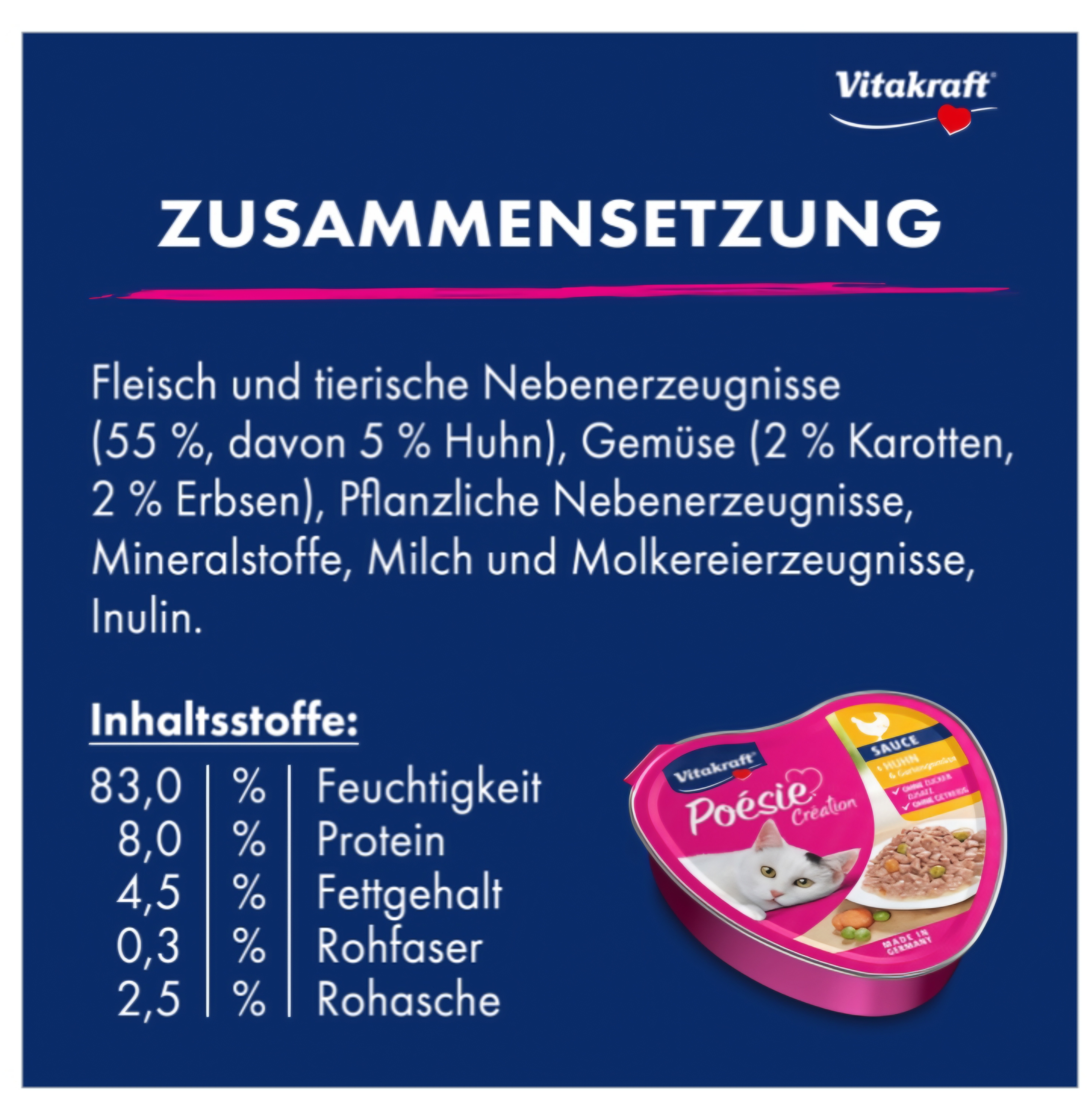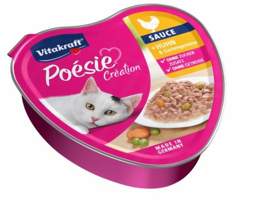 Poesie piščanec in zelenjava v omaki 85g - Mesnate grižljaje in okusna vrtna zelenjava, dovršeno začinjena z nežno omako – ta slasten obrok v srčni posodici je vsak dan znova pesem za vašo muco! Vsaka skodelica Poésie vsebuje neustavljiv okus, najboljše sestavine in uravnotežen odmerek ljubezni, torej natanko tisto, kar si vaša mačka želi. Poleg tega je slasten obrok seveda idealno prilagojen prehranskim potrebam mačk in navdušuje z najvišjo kakovostjo. In to lahko zaradi nežne priprave celo vidite. Vitakraft. Z ljubeznijo. Mokra hrana za odrasle mačke Finen obrok v dovršeni omaki S piščancem in vrtno zelenjavo Brez dodanega sladkorja Brez dodanih žitaric Brez dodanih umetnih barvil in konzervansov V srčni posodici po 85 g