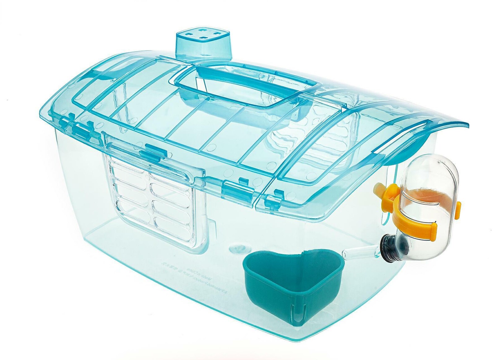 Izdelan iz nestrupene, trpežne plastike. Opremljen je s steklenico za vodo, podajalnikom in prezračevalnim oknom, ki vaši živali zagotavlja svež zrak.