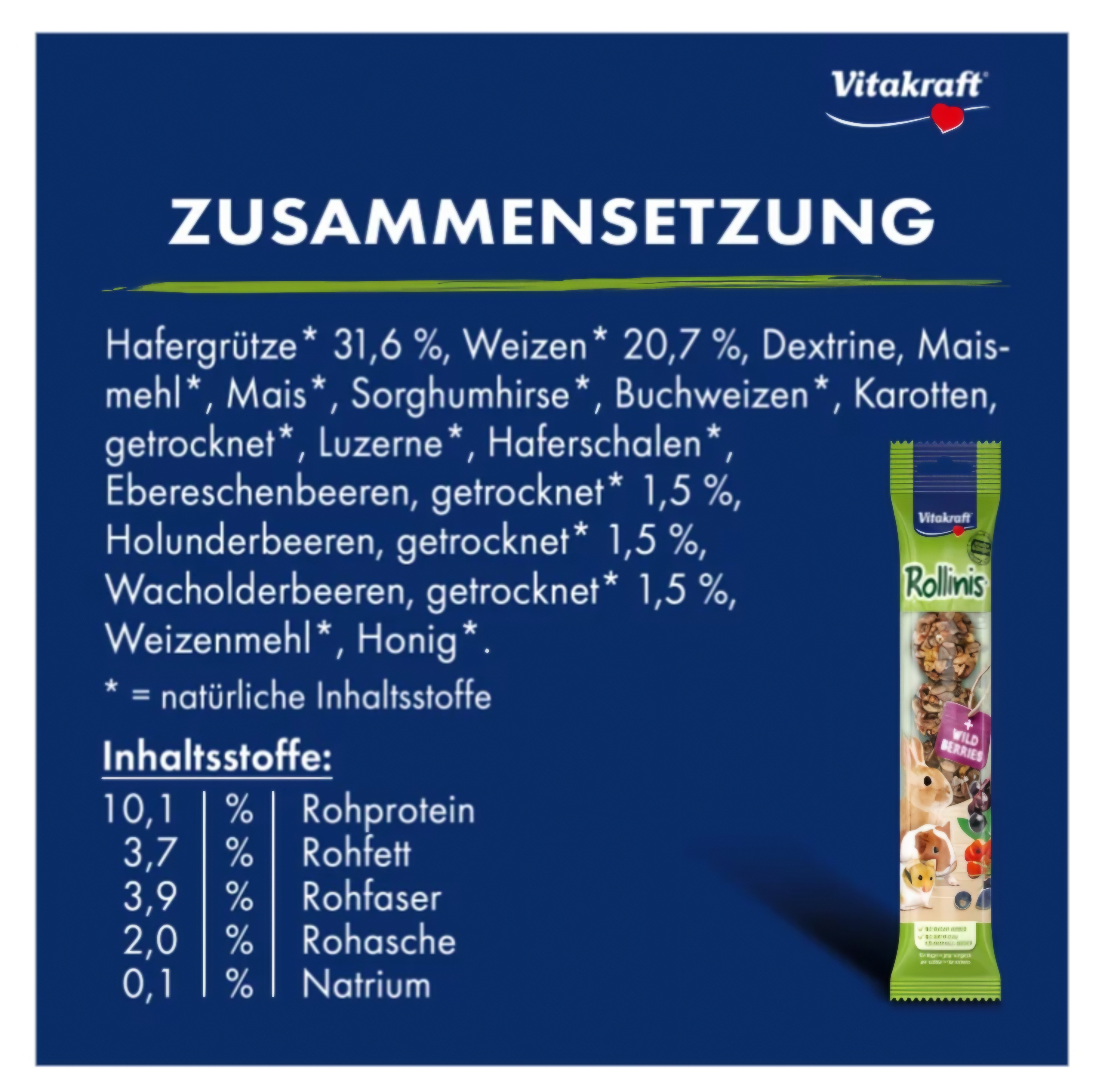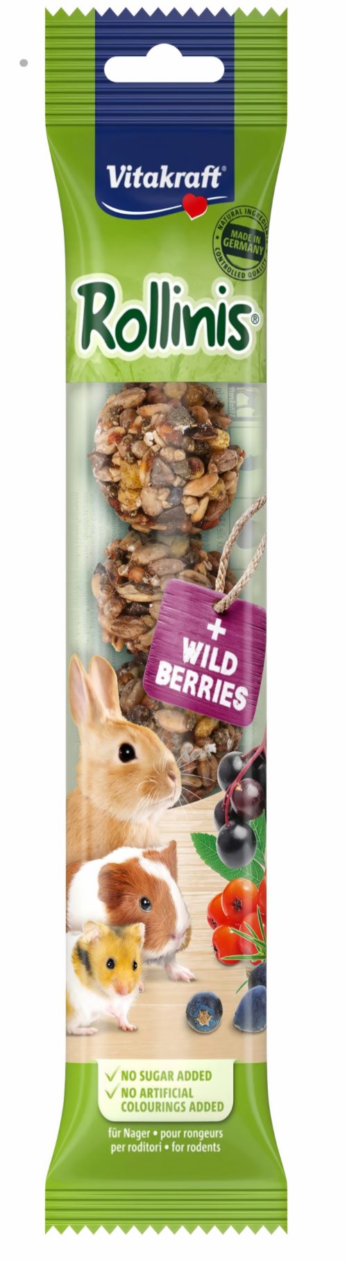 Rollinis žitne krogljice z gozdnimi jagodami 40g Vitakraft - Okusni Rollinis® so izjemno hrustljavi, zato se morajo pritlikavi kunci, morski prašički in druge male živali potruditi za svojo hrano na vrstno primeren način. Sadni koščki gozdnih jagod, ki obogatijo žitne kroglice, zagotavljajo okusen poudarek. Ti majhni prigrizki se tudi kotalijo – še posebej vznemirljiv izziv za živali. Zabava, igre in priboljšek, vse v enem!