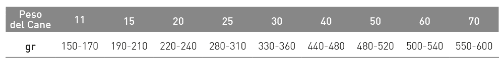 Navodila za uporabo: Pred uporabo se je priporočljivo posvetovati z veterinarjem. Priporočene količine, prikazane v tabeli, dajte glede na težo psa, kot edini vir hrane.