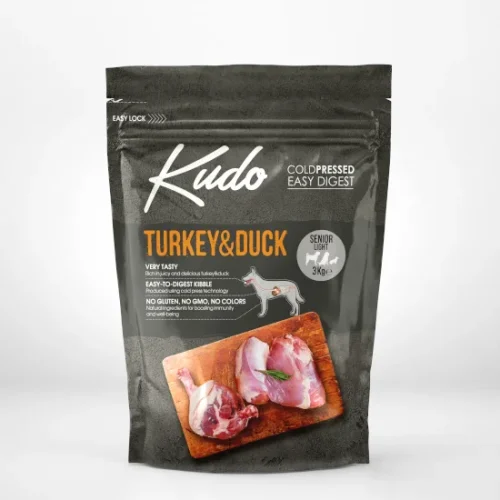Kudo Turkey & Duck Senior/Light je popolna suha hrana za pse. Predstavlja popolni obrok in vsebuje vse hranljive sestavine, ki jih potrebujejo starejši psi in psi s prekomerno telesno težo. Kudo pasja hrana je proizvedena pri nizkih temperaturah (s hladnim stiskanjem) iz najboljšega mesa, zelenjave in zelišč. Je lahko prebavljiva, saj ne vsebuje umetnih barvil, arom ali krompirja.