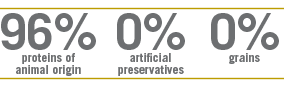 surove beljakovine 28.00%; surove maščobe 18.00%; surova vlaknina 2.90%; vlaga 9.00%; surovi pepel 8.60%; kalcij 1.10%; fosfor 0.80%; omega-6 3.30%; omega-3 0.90%; DHA 0.50%; EPA 0.30%; glukozamin 1200mg/kg; hondroitin sulfat 900mg/kg.