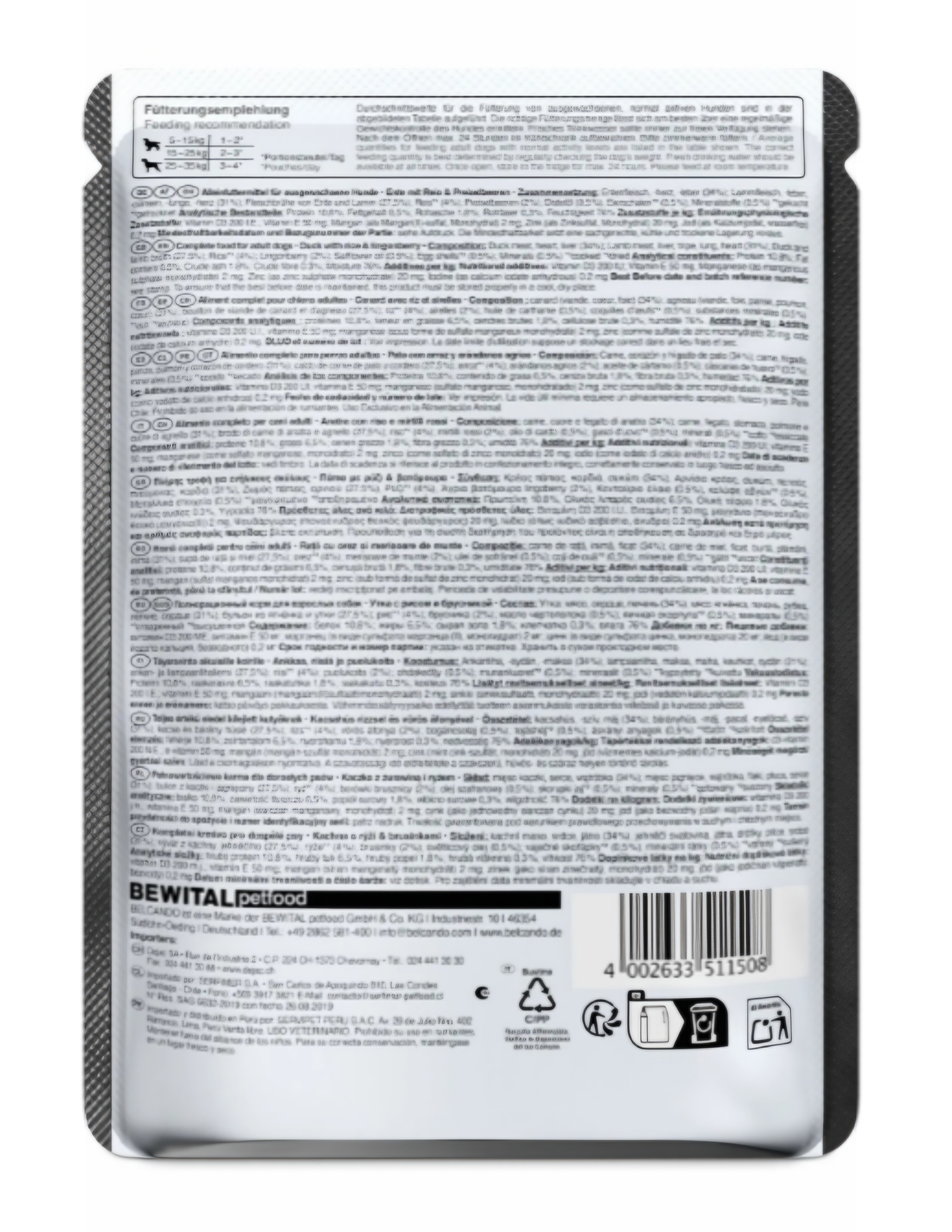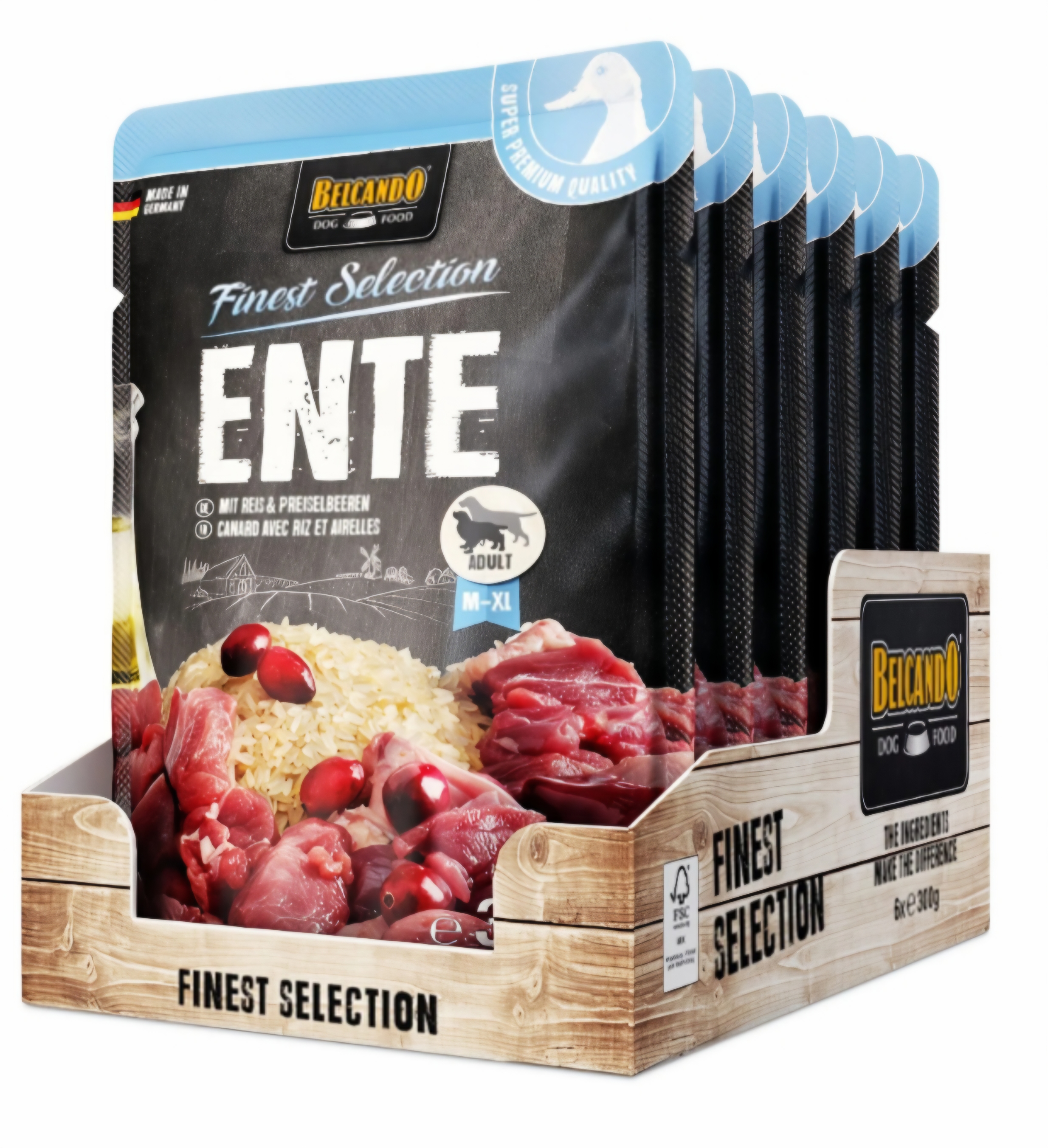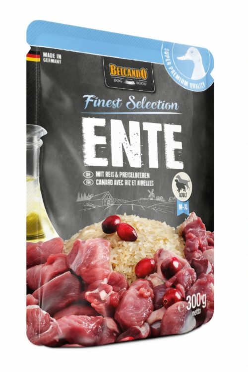Za ljubitelje race: Raca v skledo vnese obilo okusa in tudi izbirčnim ali občutljivim psom zagotavlja visokokakovostne beljakovine, zdrave maščobe in esencialna hranila za boljše počutje. Dodan riž je lahko prebavljiv in aktivnim psom nudi hitro energijo, brusnice pa dodajo sočno svežino, polno dragocenih hranil. Še ena posebnost BELCANDO Finest Selection: mehka in sijoča ​​dlaka zahvaljujoč dodatnemu odmerku žafraninega olja.