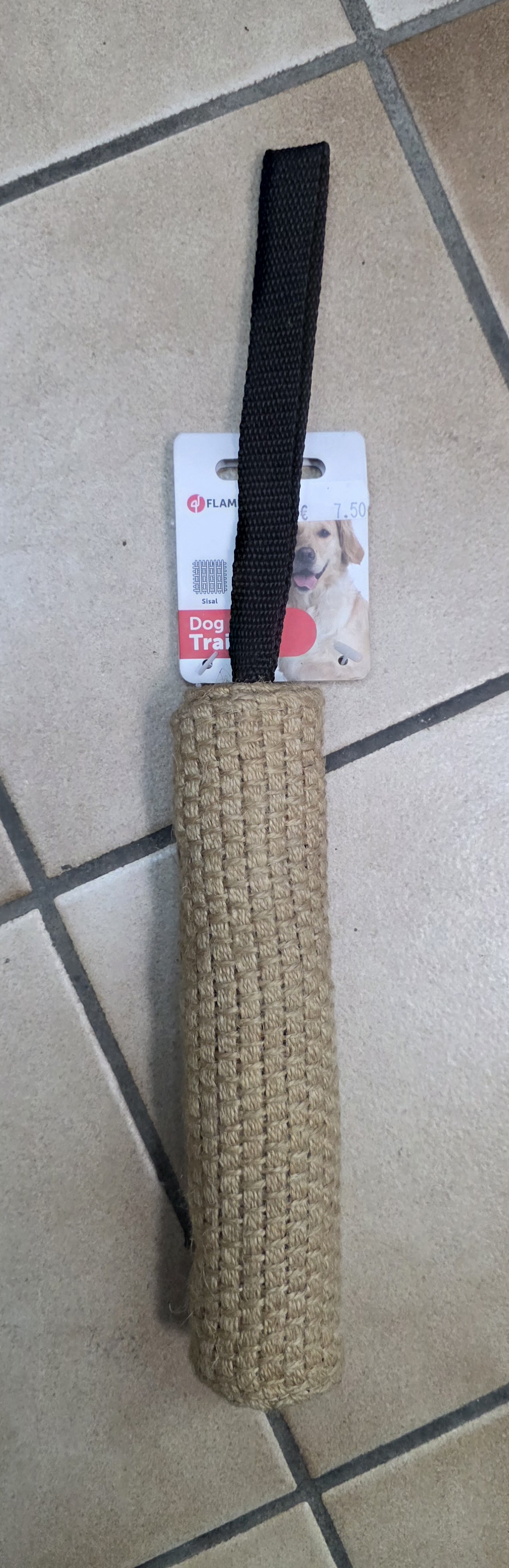 Aprot za psa Trenna z jute z ročajem 37.5x4.5cm Flamingo-Aport iz trpežne jute je odlična izbira za trening prinašanja, učenje pravilnega ugriza in aktivno igro med psom in vodnikom. Izdelan je iz močnega in odpornega materiala, ki prenese tudi intenzivnejšo uporabo pri šolanju in pasjih športih.