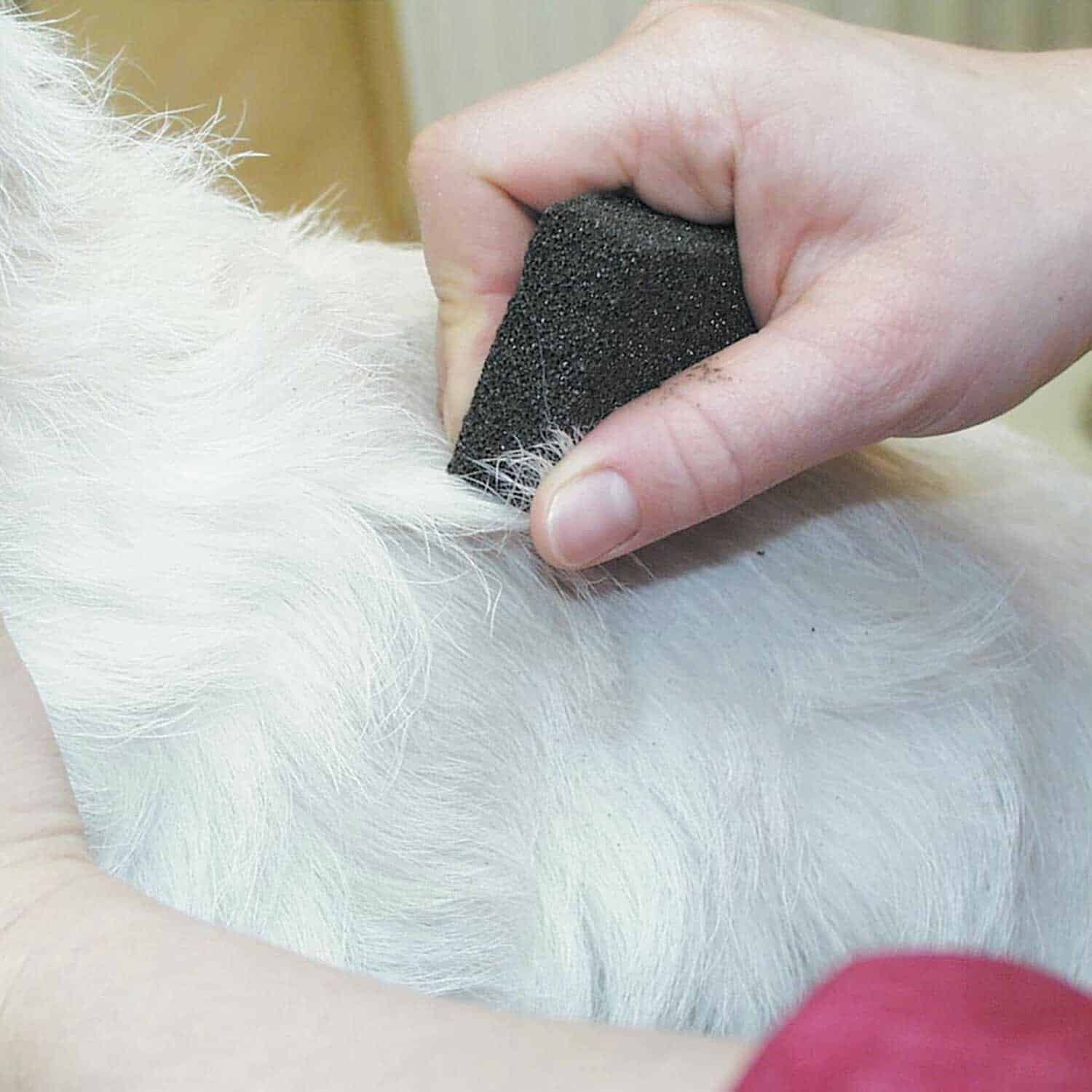 Kamen za trimanje psov ali Stripping Stone je namenjen odstranjevanju odpadajoče dlake in podlanke pri psih s kratko dlako, kot so mopsi, labradorci, bostonski terierji idr. Kamen namestite v dlan in ga pritisnite na pasji kožuh. Z blagimi potegi drsite po kožuhu v smeri rasti dlake. Pritisk kamna na pasje telo naj bo konkreten, a ne premočan. Če opazite, da je odstranjevanje dlake za psa neprijetno, zmanjšajte pritisk kamna na telo. Delajte samo v smeri rasti dlake. Potegi naj se prekrivajo in ponovijo na vsakem delu telesa vsaj trikrat. Če boste s kamnom odstranjevali odpadajočo dlako na glavi, nogah in repu, bodite še posebej nežni. Po končanem delu spihajte pasji kožuh s sušilnikom ali pa skrtačite s sintetično krtačo.