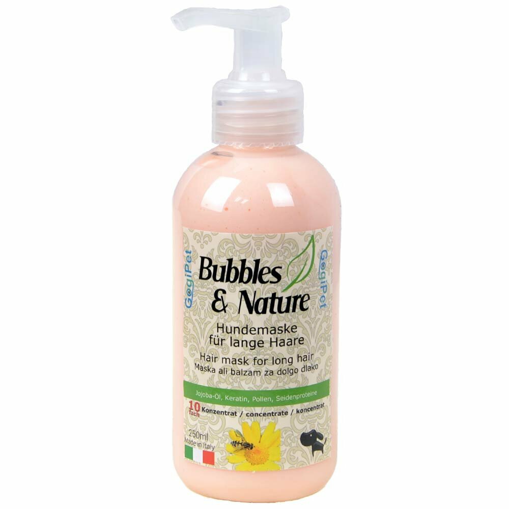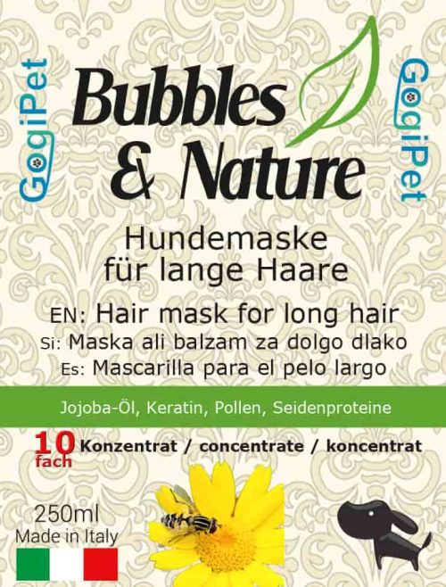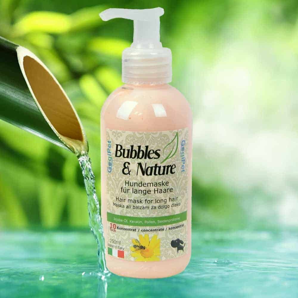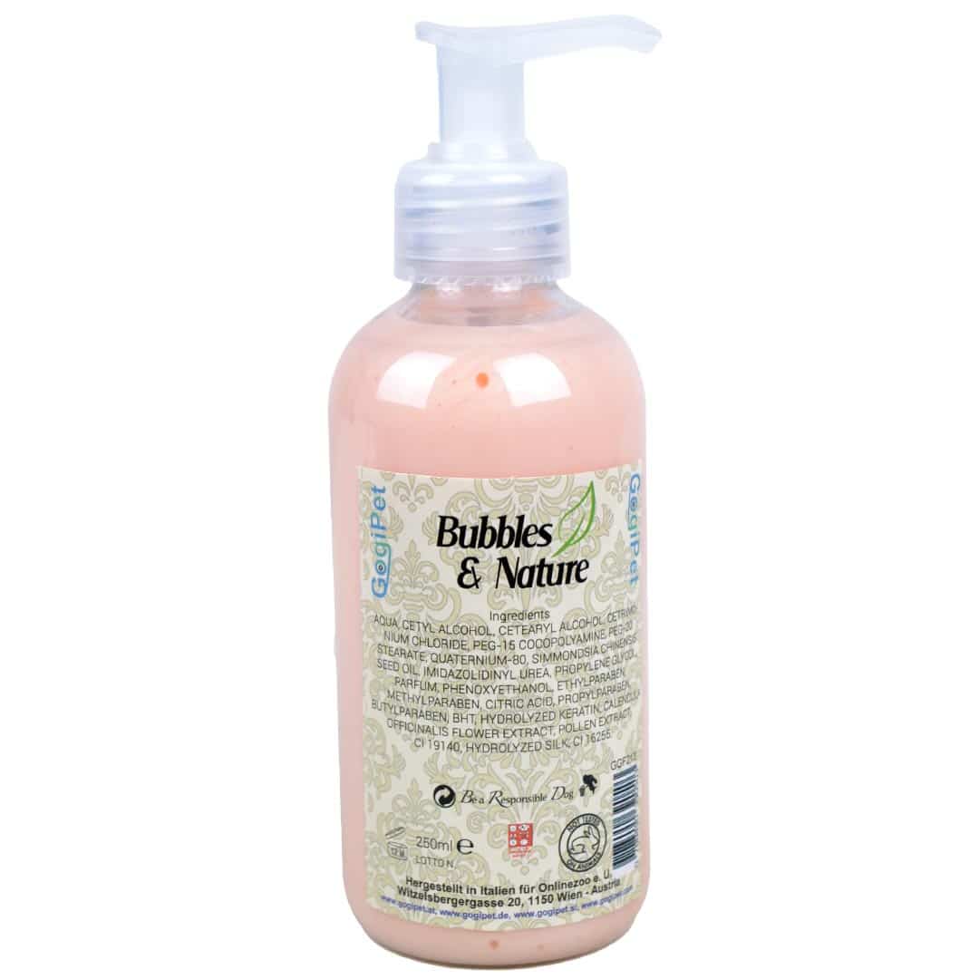 Bubbles & Nature balzam za zavozlano dlako - GogiPet balzami za pse Bubbles & Nature so izdelani iz naravnih sestavin. Primerni so za domačo in profesionalno uporabo. Balzami so na evropskem tržišču prisotni več kot 15 let. Pakirani so v prozornih plastenkah, ker želi proizvajalec pokazati strukturo balzama. Balzam za zavozlano dlako ima prikazano surovinsko sestavo.