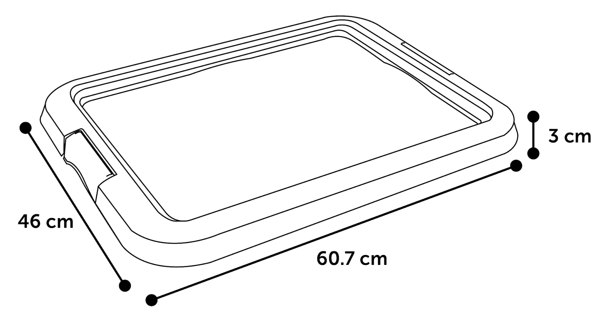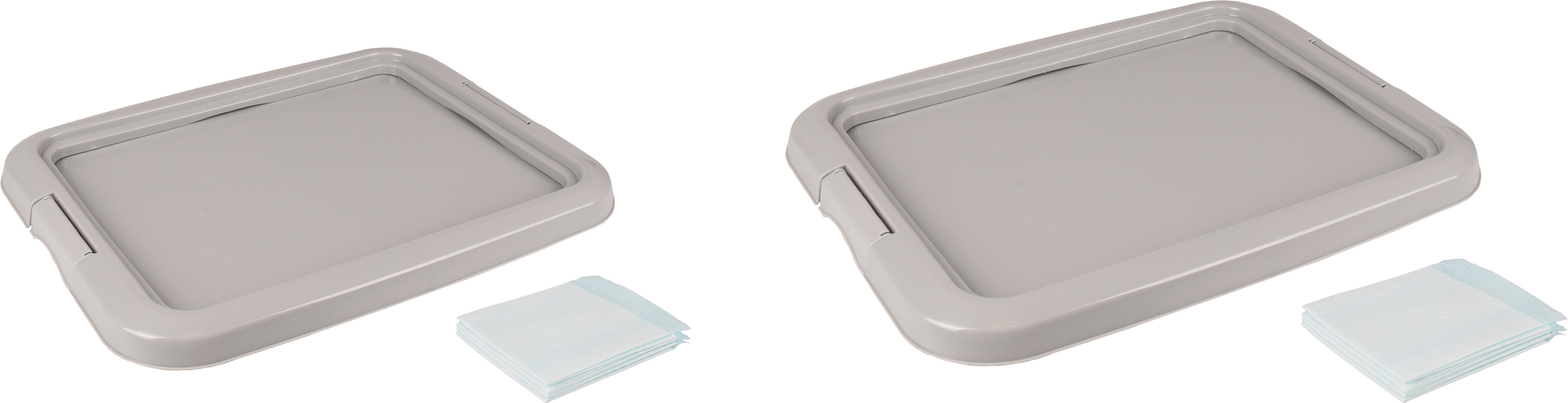 Na plastičen pladenj, ki ima za večjo stabilnost proti zdrsno ojačitev na dnu, položimo vpojno podlogo, preko nje pa še posebno plastično mrežico, ki podlogo zaščiti, da je kužek ne spraska in ohranja njegove tačke suhe.