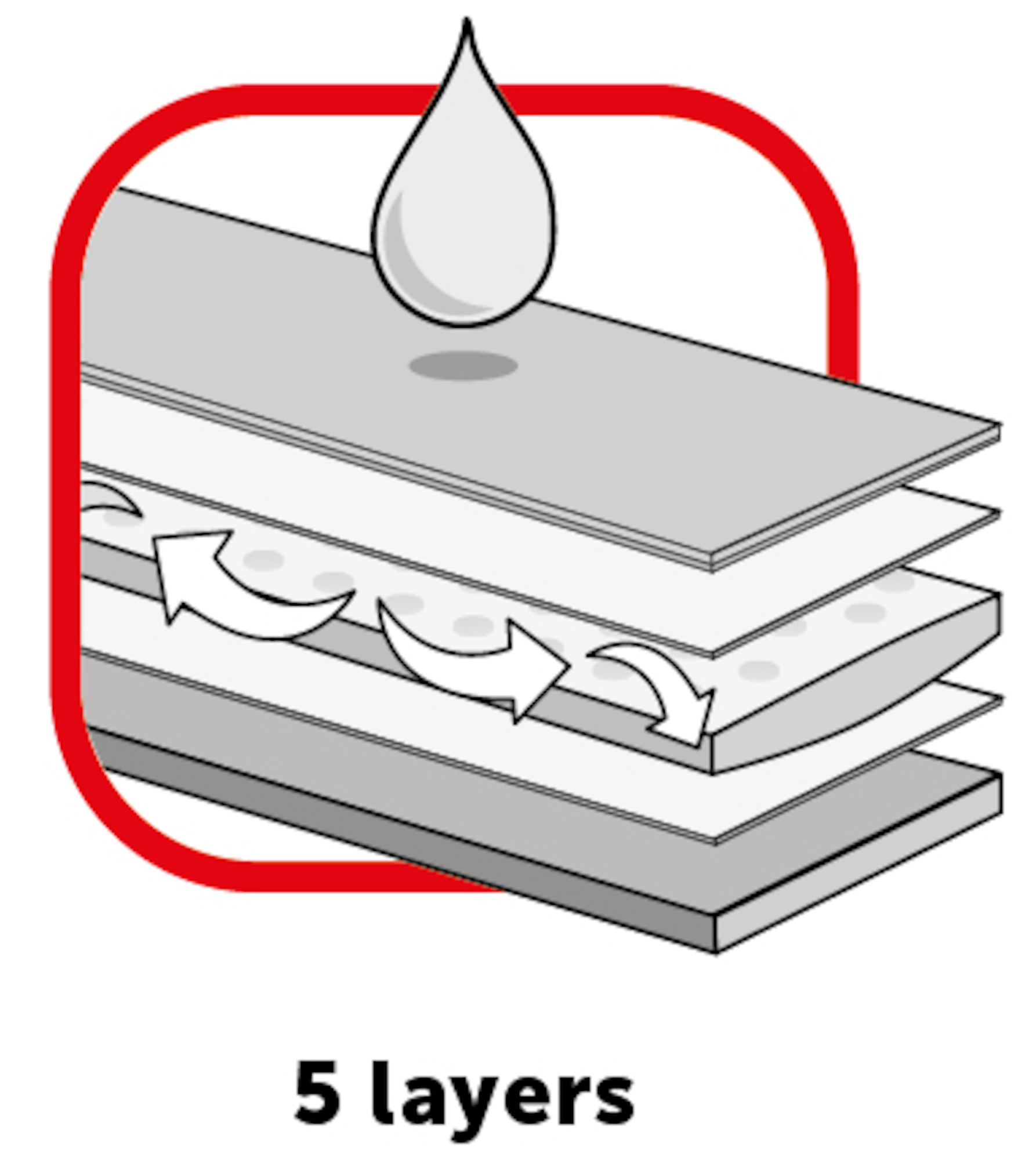 Podloga ima večslojni vpojni sistem z gelnim jedrom, ki zagotavlja maksimalno zadrževanje tekočin in vonjav.