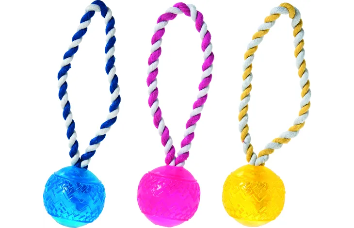 Dolgočasen mladiček? Ne več s temi žogami! Vrvica omogoča enostavno metanje in zagotavlja kvaliteten čas s kosmatim prijateljem. Izbirajte med modro, roza ali rumeno.