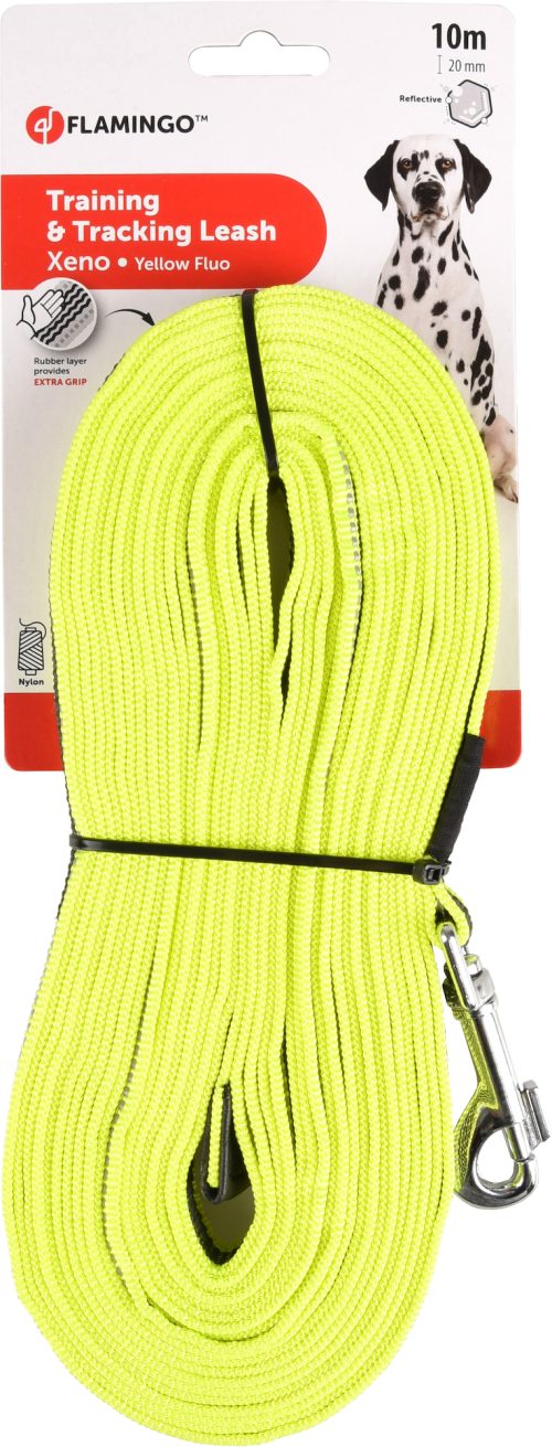 Odsevni sledni povodec neon rumen 10m / 20mm Flamingo - Za vadbo in sledenje Xeno je narejen iz najlona in gume za dodaten oprijem in se vidi tudi v temi!