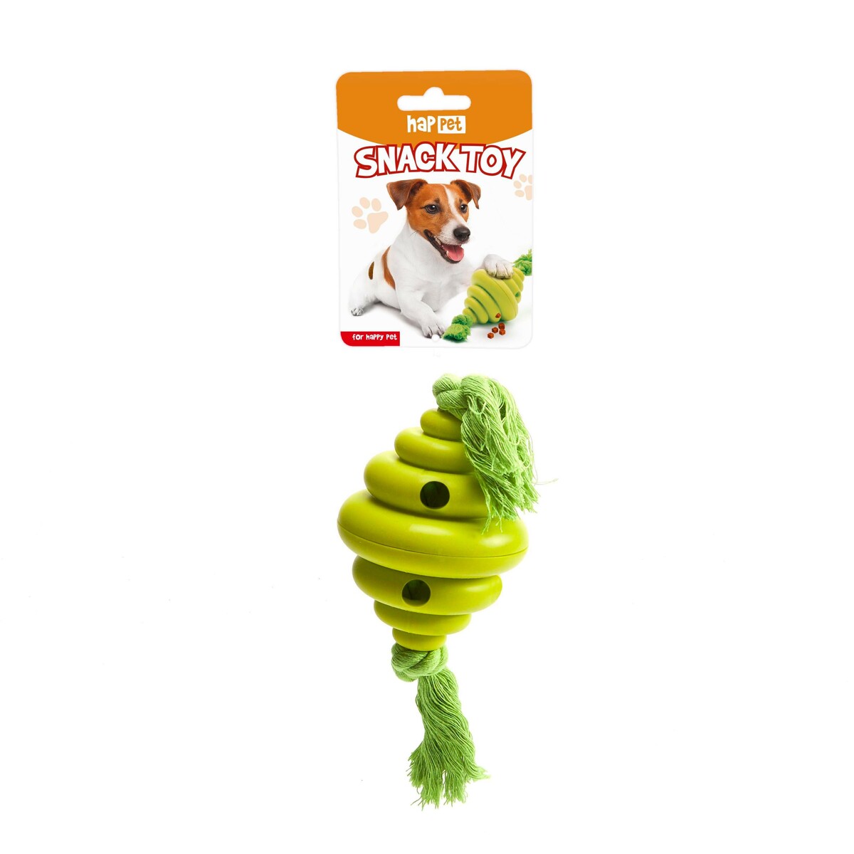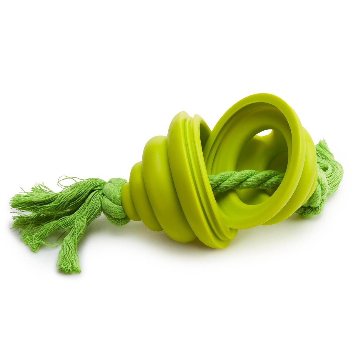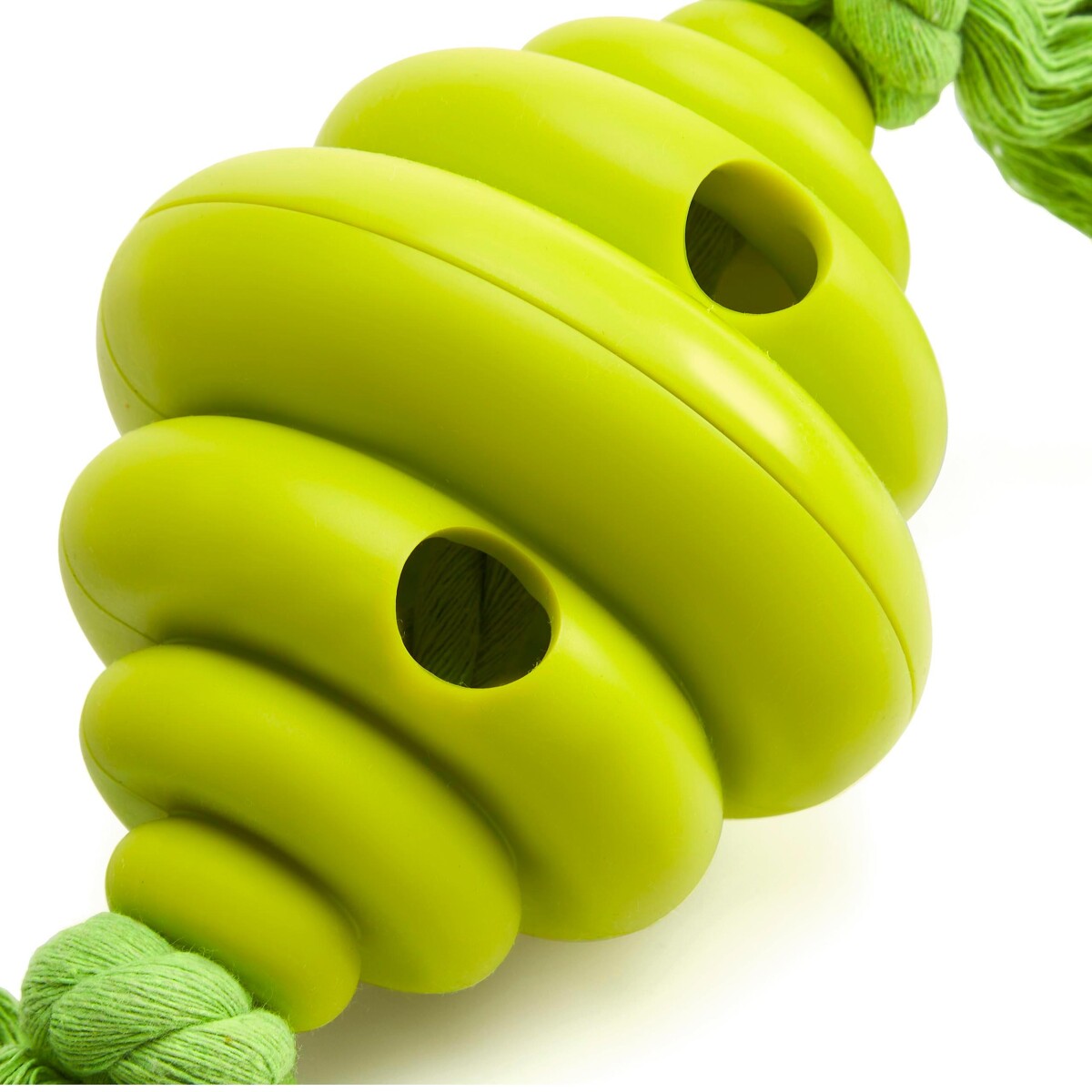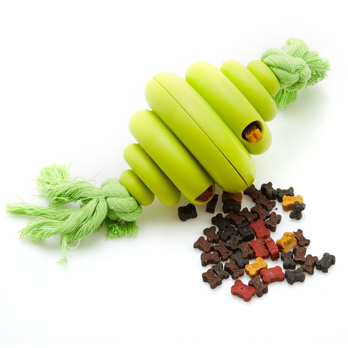 Živahna zelena barva ne le da pritegne pozornost, temveč doda energijo vsaki igri. Igrača je zasnovana tako, da lahko vanjo postavite priboljške, ki se med žvečenjem in vlečenjem postopoma sproščajo, s čimer spodbuja mentalno aktivnost in dolgotrajno zabavo. Hkrati struktura za vlečenje omogoča interaktivno igro med lastnikom in psom, kar krepi vez in spodbuja pozitivno vedenje.