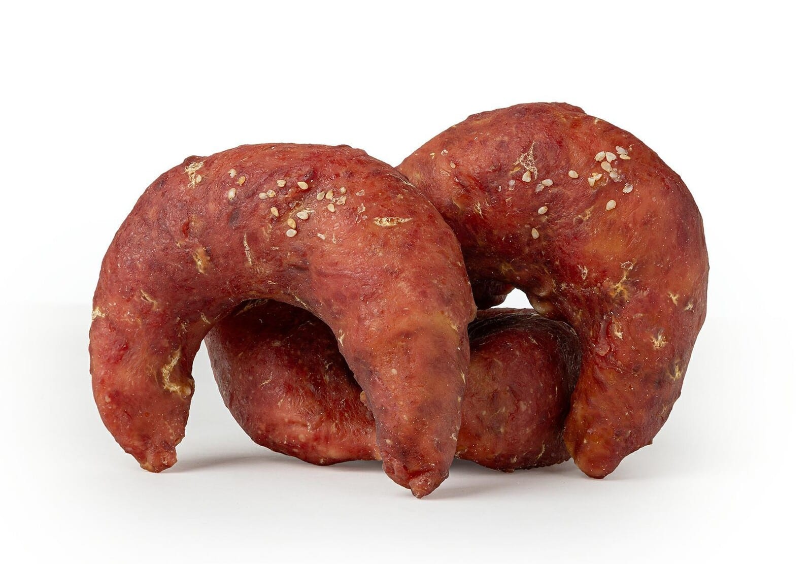 Priboljšek za pse rogljiček z raco - slastni rogljički za vašega kužka. Je čudovita pasja poslastica iz serije pekarne Happ, inspirirana po klasičnih pekarskih slaščicah. Vsak rogljiček je zelo podoben pravemu rogljičku – tako po obliki kot po videzu – kar ga naredi privlačnega ne le za pse, ampak tudi za njihove lastnike. Idealna izbira za kužke, ki ljubijo edinstvene oblike in zanimive okuse. Ta različica vključuje štiri kose, ki združujejo meso račjih prsi (22%) z naravno surovo kožo (73,5%), kar ponuja odlično teksturo in visoko hranilno vrednost. Dodatki, kot sta sezam in sorbitol, pomagajo pri prebavi in izboljšajo okus.