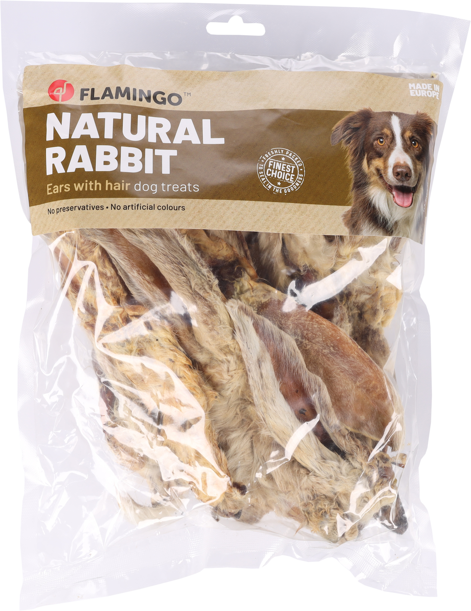 Priboljški za pse kunčja ušesa z dlako 200g Flamingo -Pocrkljajte svojega psa z naravnimi prigrizki iz kunca, ki so brez glutena in brez sladkorja. Popolnoma naravni in brez umetnih barvil ali konzervansov. Samo za informacijo: velikost in teža na kos se lahko razlikujeta. Izdelano v Evropi
