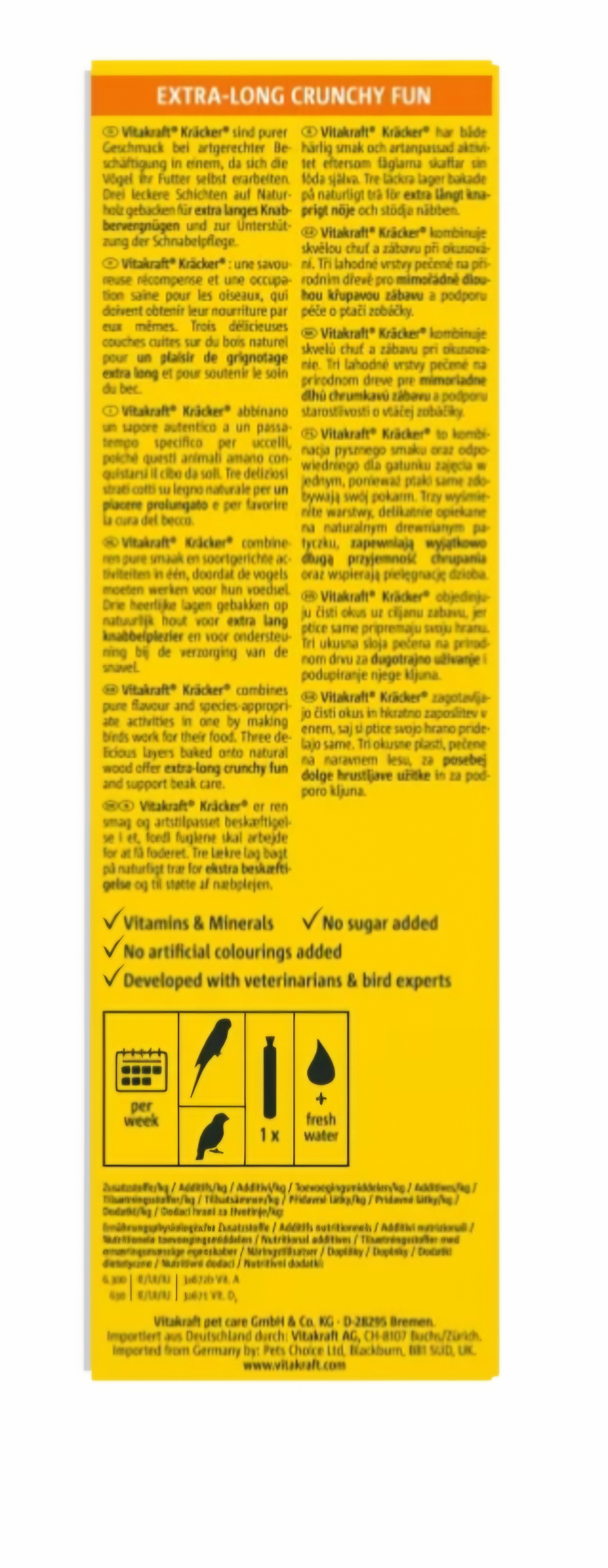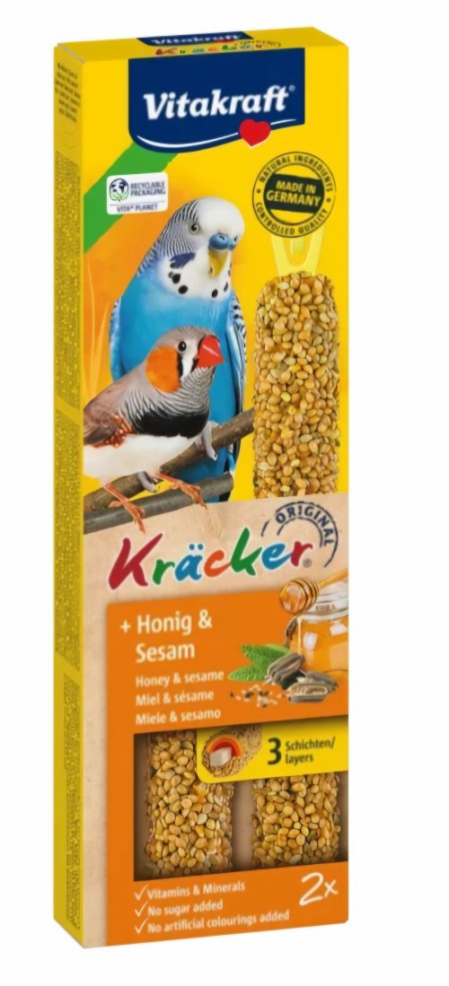 Vitakraft krekerji za male papige z medom 2 kosa-Priljubljen Kräcker® z dragocenimi semeni obljublja čisti okus in je dobrodošla sprememba v prehrani papig in eksotov.