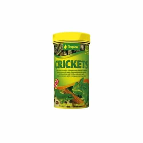 TROPICAL CRICKETS sušeni črički 250ml-Celi posušeni črički so naravna možnost za hranjenje plazilcev in dvoživk. Majhne žuželke so primerne tudi za hranjenje velikih akvarijskih rib. Njihov širok prehranski spekter se ponaša z visoko vsebnostjo beljakovin in maščob. Črički vsebujejo tudi hitin. Zahvaljujoč nežnemu sušenju so hranilne vrednosti še posebej dobro ohranjene.
