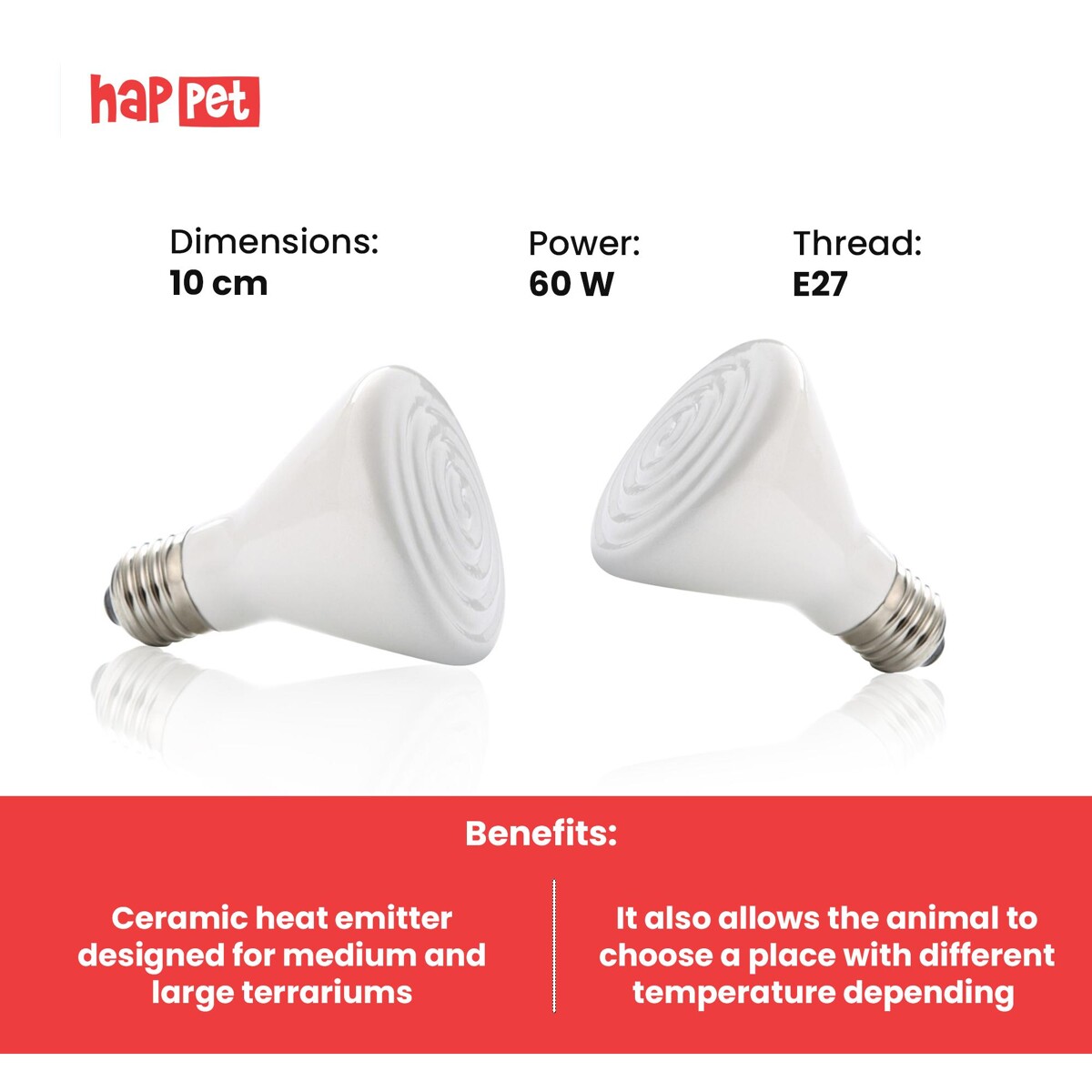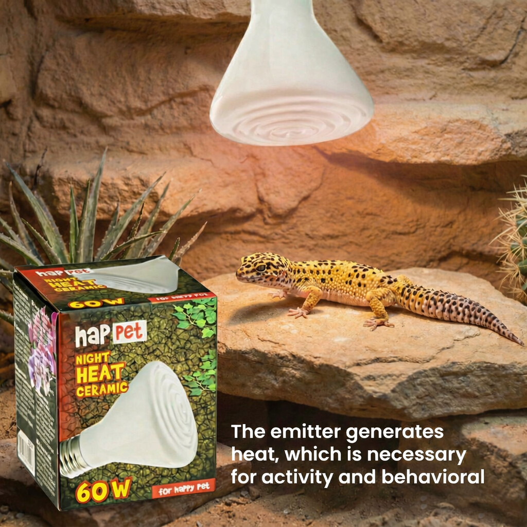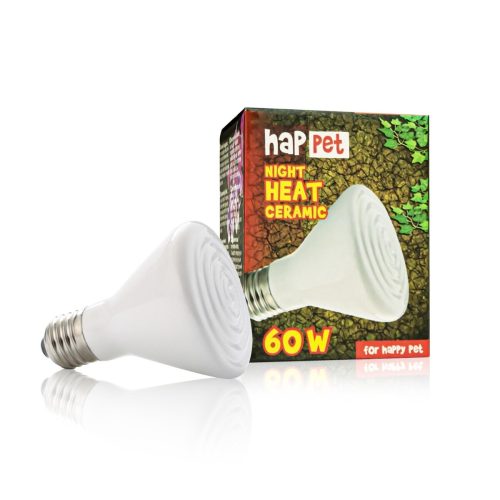 Grelna žarnica za plazilce Happet, 60 W- Keramična žarnica - grelnik je zasnovan za srednje velike in velike terarije. Uporablja se lahko kot osnova za ogrevalni sistem za kuščarje, kače, želve, dvoživke, členonožce in termofilne sesalce (kot so pritlikavi ježi in pritlikave miši). Žarnica ustvarja toploto, ki je potrebna za aktivnost in fiziološke procese, ne da bi oddajal svetlobo. To omogoča njegovo uporabo kot 24-urni vir toplote in za zadrževanje nočnih živali (npr. leopardjih gekonov) in živali, ki niso navdušene nad močno, intenzivno svetlobo (večina vrst kač, ptic, tropskih škorpijonov). Žarnica omogoča ustvarjanje con z različnimi temperaturami v terariju. Lokalno nihanje temperature v terariju je pomembno, saj preprečuje pregrevanje živali. Prav tako omogoča živali, da izbere prostor z različno temperaturo, odvisno od njenega fiziološkega stanja, preferenc in potreb (topleje po obroku, hladneje po intenzivnem sončenju). Enota je opremljena z univerzalnim navojem E27 in je primerna za večino komercialno dostopnih nosilcev in pokrovov.