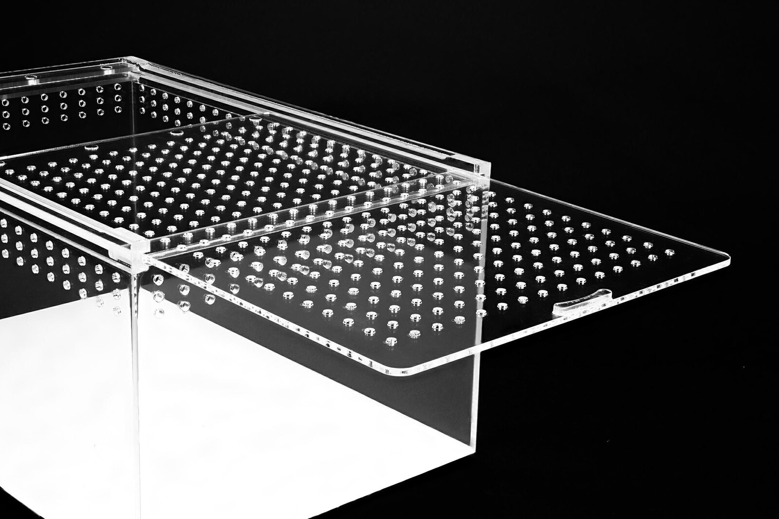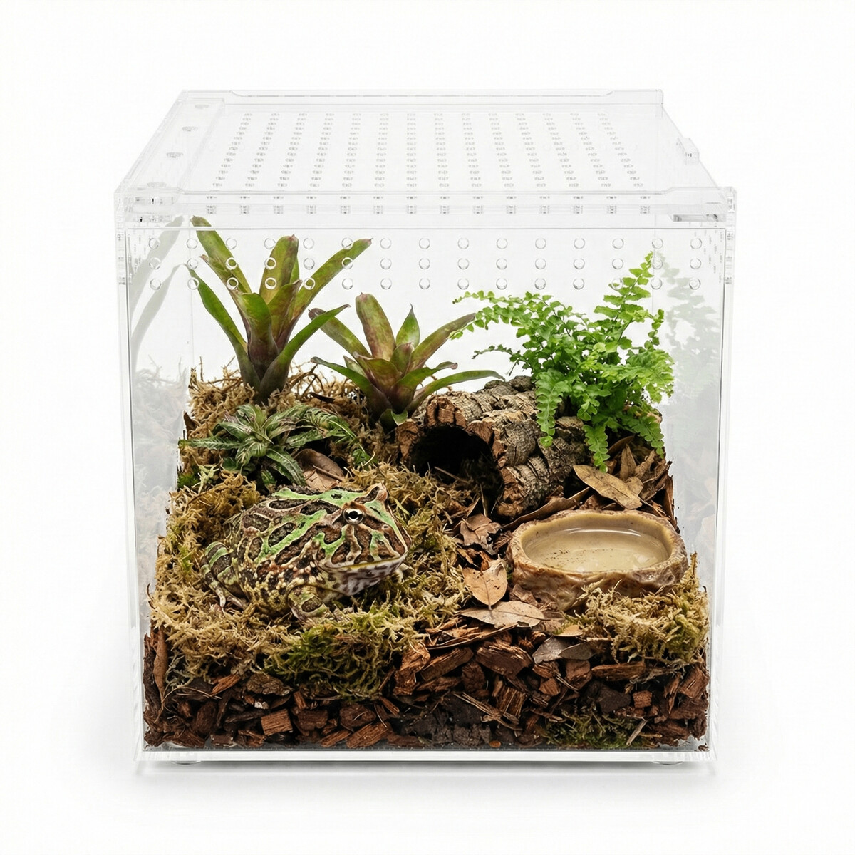 Terarij je izdelan iz kakovostnega akrila, ki omogoča izjemno transparentnost brez lomljenja svetlobe. To pomeni popolnoma jasen pogled v notranjost terarija in boljši nadzor nad živaljo. V primerjavi s steklom je akril lažji in bolj odporen na udarce, zato je terarij varnejši za uporabo in enostavnejši za premikanje.