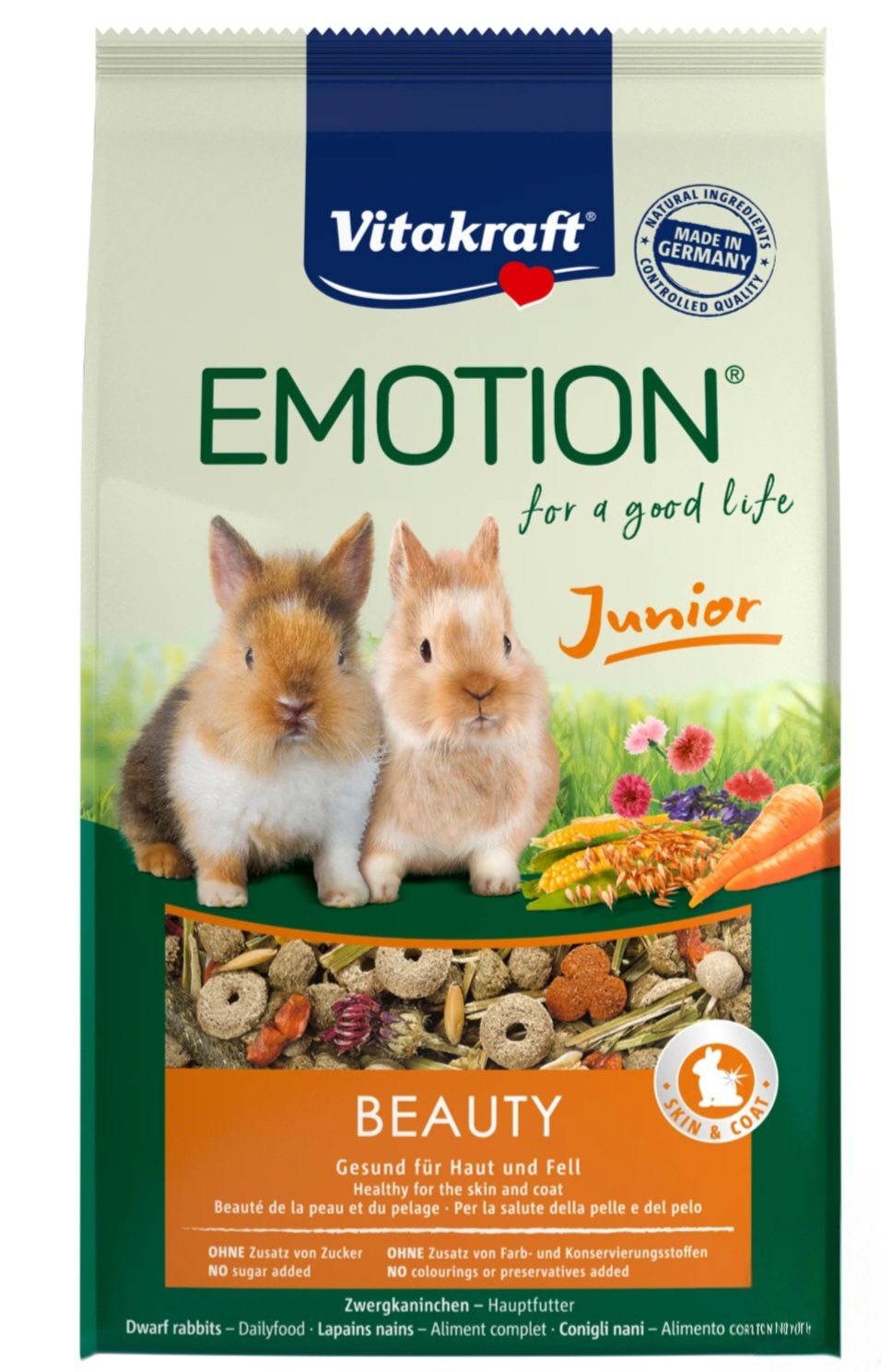 Vitakraft Emotion Beauty Junior je uravnotežena in hranilno bogata popolna hrana, posebej razvita za mlade kunce do 6. meseca starosti. Njena skrbno izbrana sestava podpira zdravo rast, razvoj in vitalnost v najpomembnejšem obdobju življenja mladega kunca.