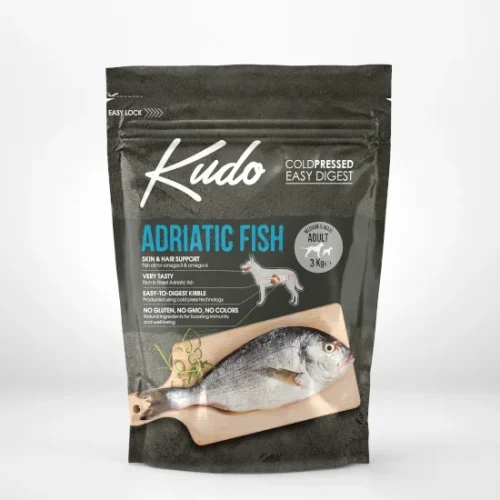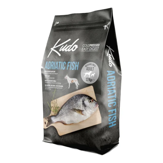 Kudo Jadranska riba Adult Medium & Maxi je popolna suha hrana za pse. Predstavlja popolni obrok in vsebuje vse hranljive sestavine, ki jih potrebujejo odrasli srednji in veliki psi. Kudo pasja hrana je proizvedena pri nizkih temperaturah (s hladnim stiskanjem) iz najboljšega mesa, zelenjave in zelišč. Je lahko prebavljiva, saj ne vsebuje umetnih barvil, arom ali krompirja.