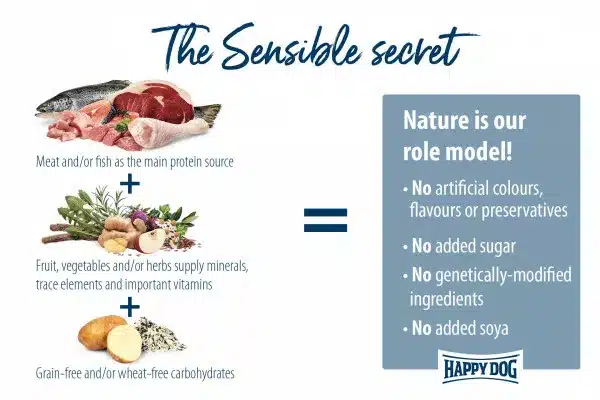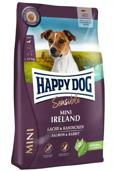 Vsem pasjim gurmanom, ki iščejo nekaj posebnega, so zelo občutljivi ali izbirčni, ponuja. Happy Dog edinstveno popolno hrano Ireland, Super-Premium kakovosti s finim lososom in okusnim kuncem. Zaradi skrbno izbranih sestavin (brez jagnjetine in perutnine, brez riža, soje in pšenice), skrbnega proizvodnega procesa in posebno prilagojenega deleža beljakovin in energije. Se Happy Dog Ireland izvrstno obnese tudi kot prehrana za občutljive pse. Briketi so optimalno prilagojeni ugrizu psov malih pasem. To ekskluzivno recepturo dopolnjuje še edinstven Happy Dog Natural Life koncept® iz naravnih sestavin. Proizvedeno v Nemčiji pod strogim nadzorom kakovosti!